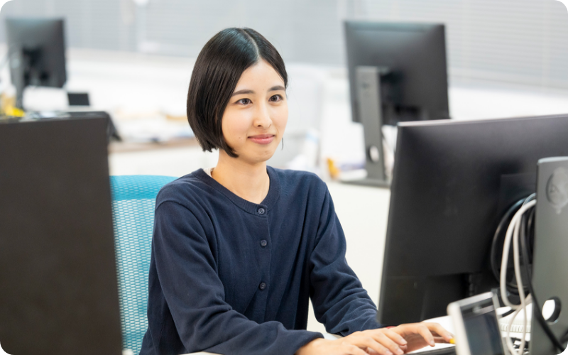 主にサービス業のお客様を担当する営業部の内勤として、お客様の開示書類を制作する上での進行管理を行っています。営業とペアを組むCS課は、制作プロセス全体を見つつお客様と社内の各専門部をつなぎ、より良い制作物をつくりあげていく、連携役のような存在と言えるかもしれません。お客様からシステムの操作や記載内容のお問い合わせを受けた際には、ICT部門やディスクロージャー研究部門など専門部の方の力を借りながら回答をしたり、修正または印刷のプロセスではその指示出しを制作部門・印刷部門の方に行うなど、制作物完成まで、お客様をサポートしています。