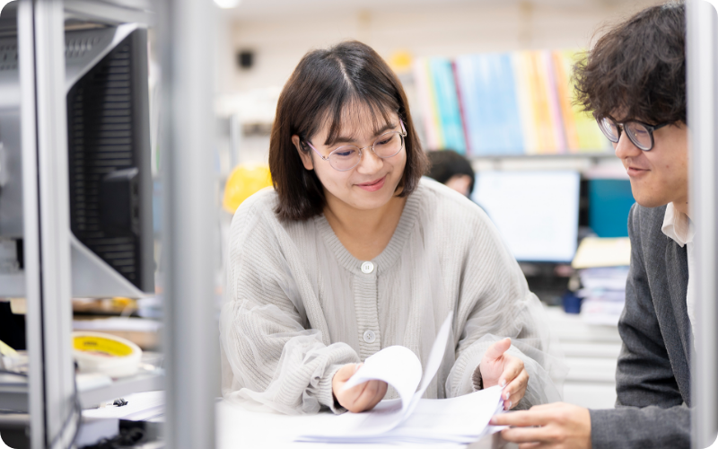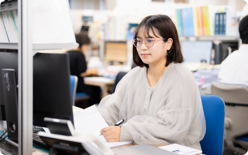 最初は何もかも初めて聞く用語ばかり。指導担当の先輩から具体的な原稿実例に基づいて説明を受け、その名称や意味を必死に覚えました。また、自ら積極的に過去事例や処理済みの書類に当たり、疑問点解消や起きやすいミスの把握などに努めました。おかげで1年目の後半には、それぞれ “点”だった知識が頭の中で“線”としてつながり、問い合わせ対応や原稿チェックの仕事の幅が広がっていきました。