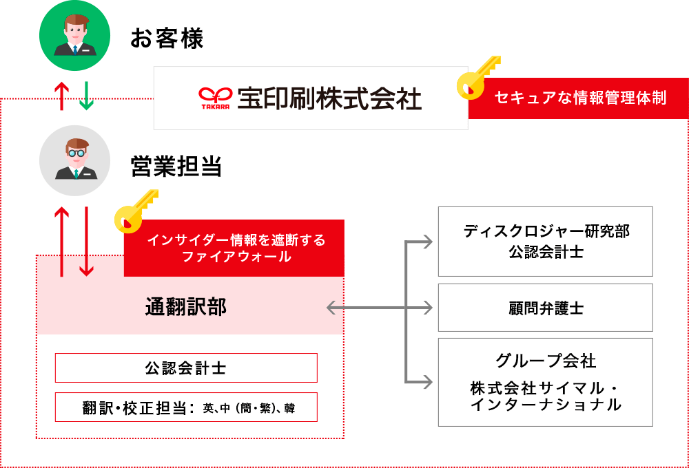 - 開示前のインサイダー情報の翻訳や、取締役会資料等の機密書類の翻訳に対応した管理体制を徹底しております。